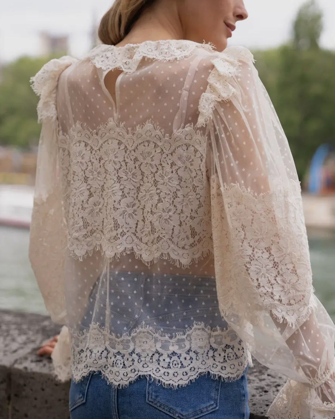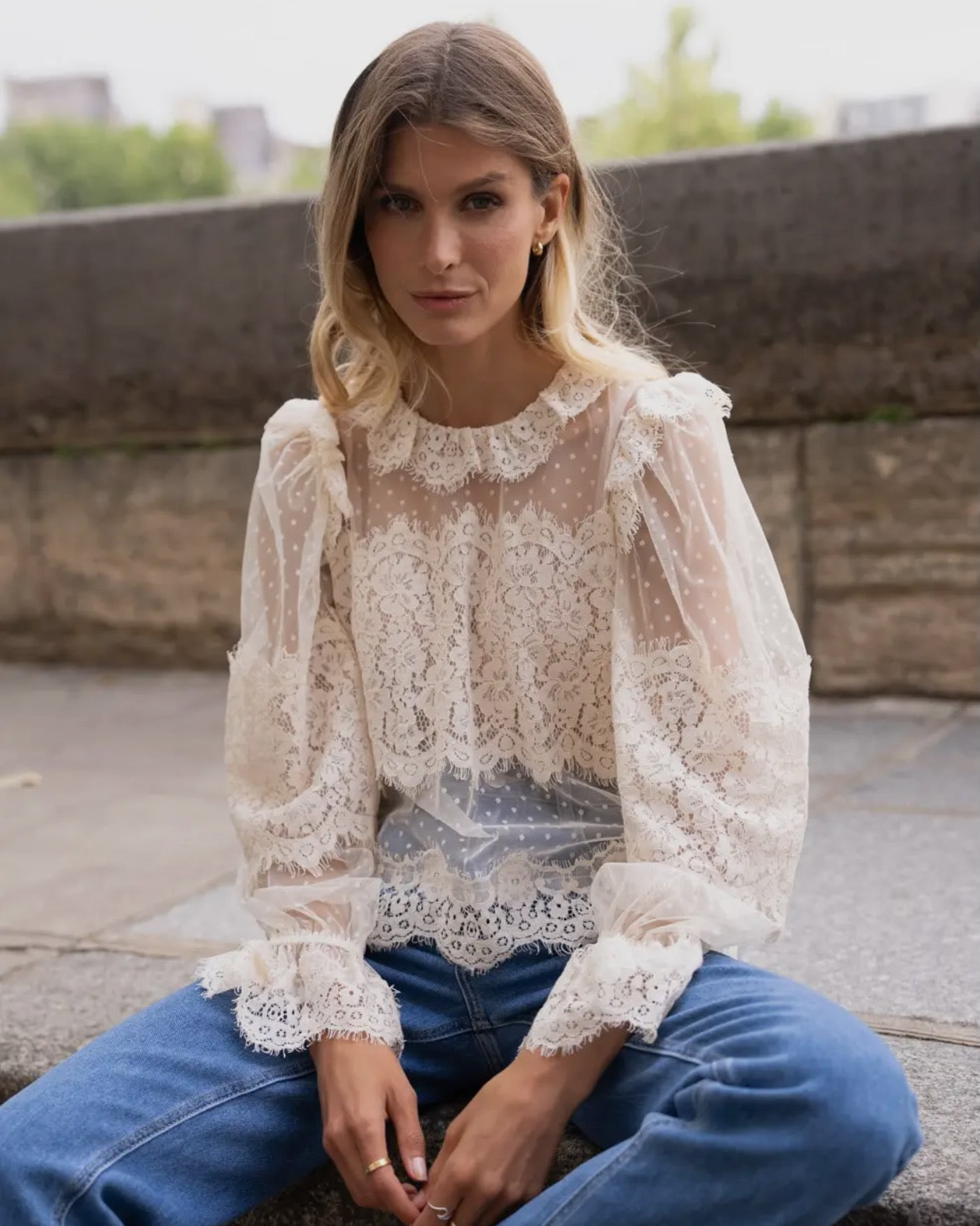 Smuk blonde bluse med lange ærmer og flotte detaljer som lille blondekarve. blusen bliver luikket i ryggen med en enkelt knap. Flot at kombinere med jeans for et mere hverdags look. eller med nederdel og vide bukser til selskab og fest.
