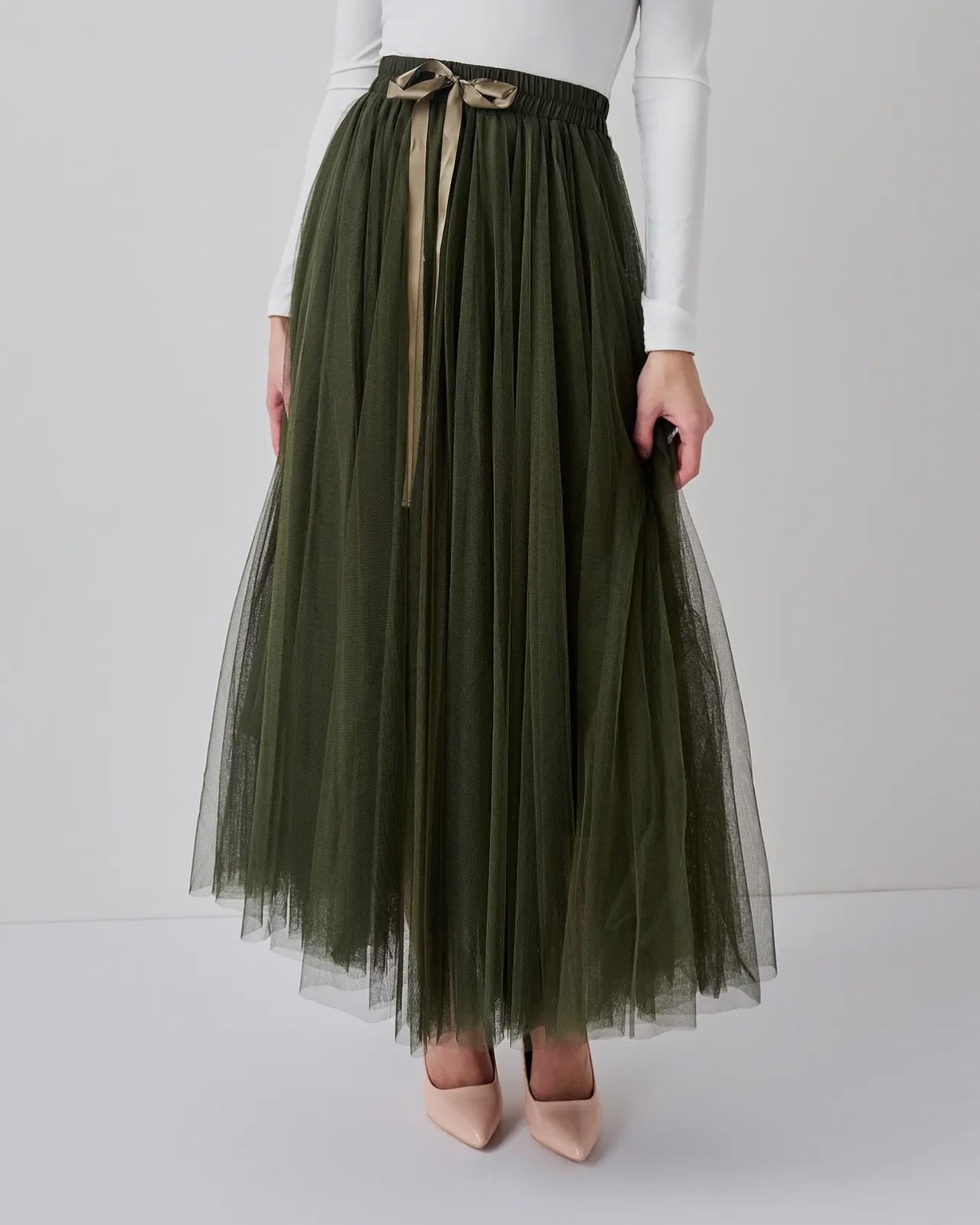 Lang nederdel i tyl med en fin elastisk linning. Mere end 11m tyl er der brugt til denne ikoniske nederdel. Lag med masser af vidde, fremhævet af rynker, der giver en flæseeffekt forneden. Den fås i en række flotte farver. Det lette tone i tone foerstykke gør at nederdelen ikke er gennemsigtig.