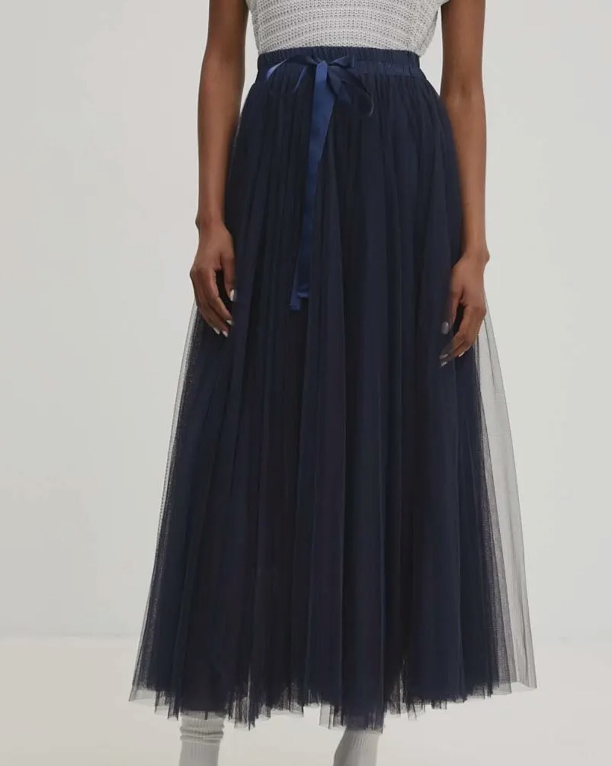 Lang nederdel i tyl med en fin elastisk linning. Mere end 11m tyl er der brugt til denne ikoniske nederdel. Lag med masser af vidde, fremhævet af rynker, der giver en flæseeffekt forneden. Den fås i en række flotte farver. Det lette tone i tone foerstykke gør at nederdelen ikke er gennemsigtig.
