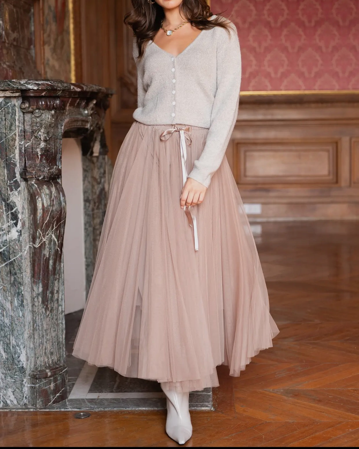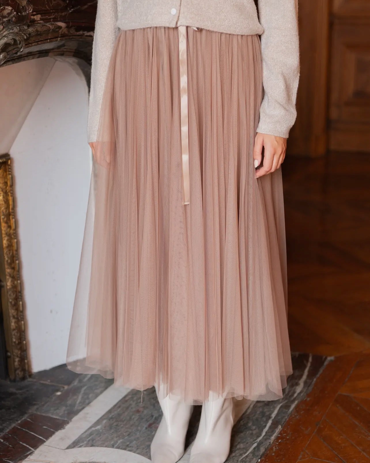 Lang nederdel i tyl med en fin elastisk linning. Mere end 11m tyl er der brugt til denne ikoniske nederdel. Lag med masser af vidde, fremhævet af rynker, der giver en flæseeffekt forneden. Den fås i en række flotte farver. Det lette tone i tone foerstykke gør at nederdelen ikke er gennemsigtig.