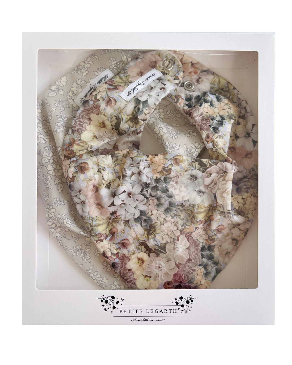 Savlesmæk i Liberty stof med bagside af blød fleece, som holder brystet tørt og varmt. Savlesmække er designet så den sidder som et tørklæde og kan derfor også bruges hvis man blot ønsker et lunt tørklæde-look.