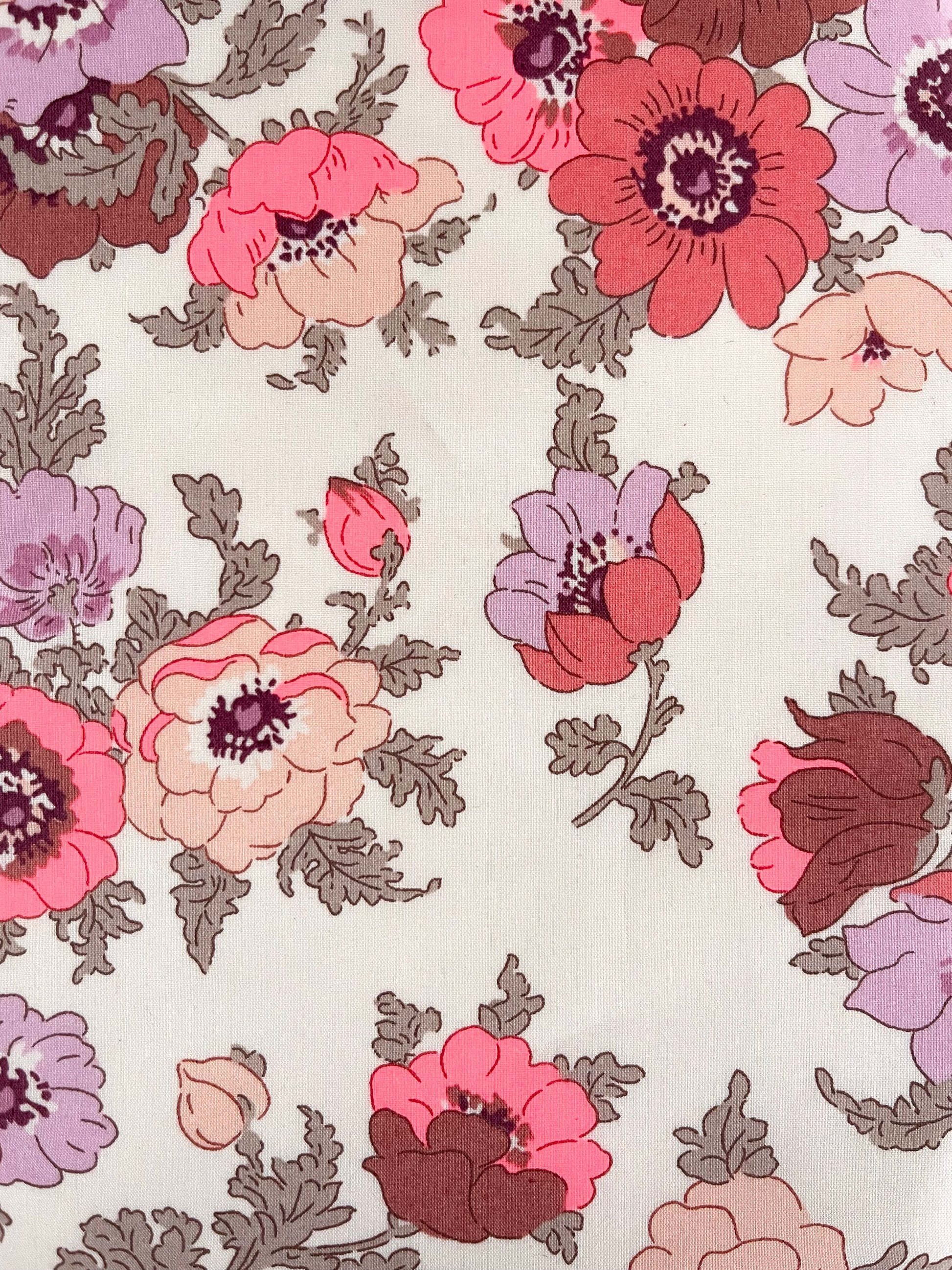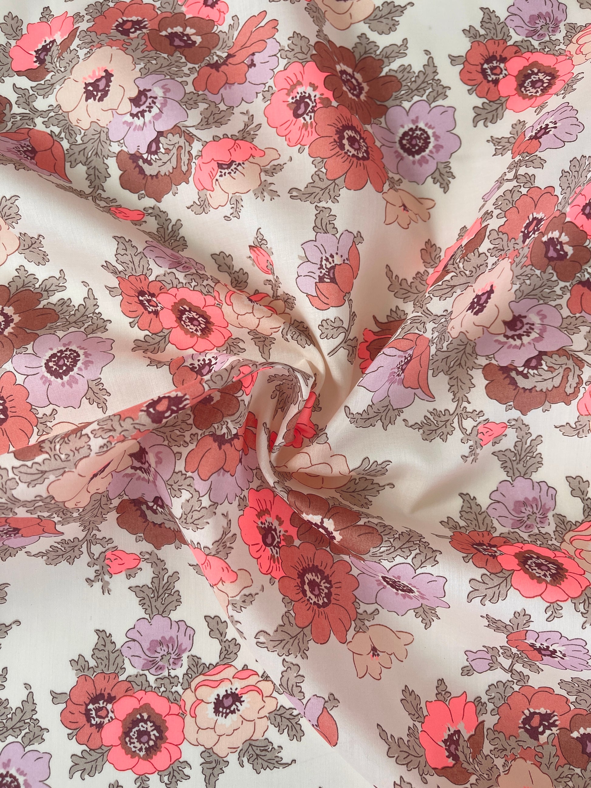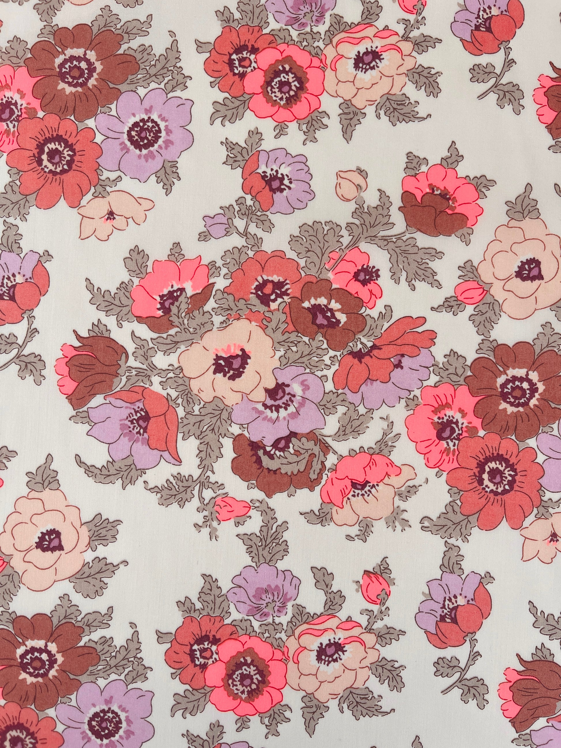 Liberty stof - Madeleine er et mellemstort blomsterprint - med smukke neonfarvede blomster - du finder denne farvekombination i Libertys forår/sommer 2025 kollektion.