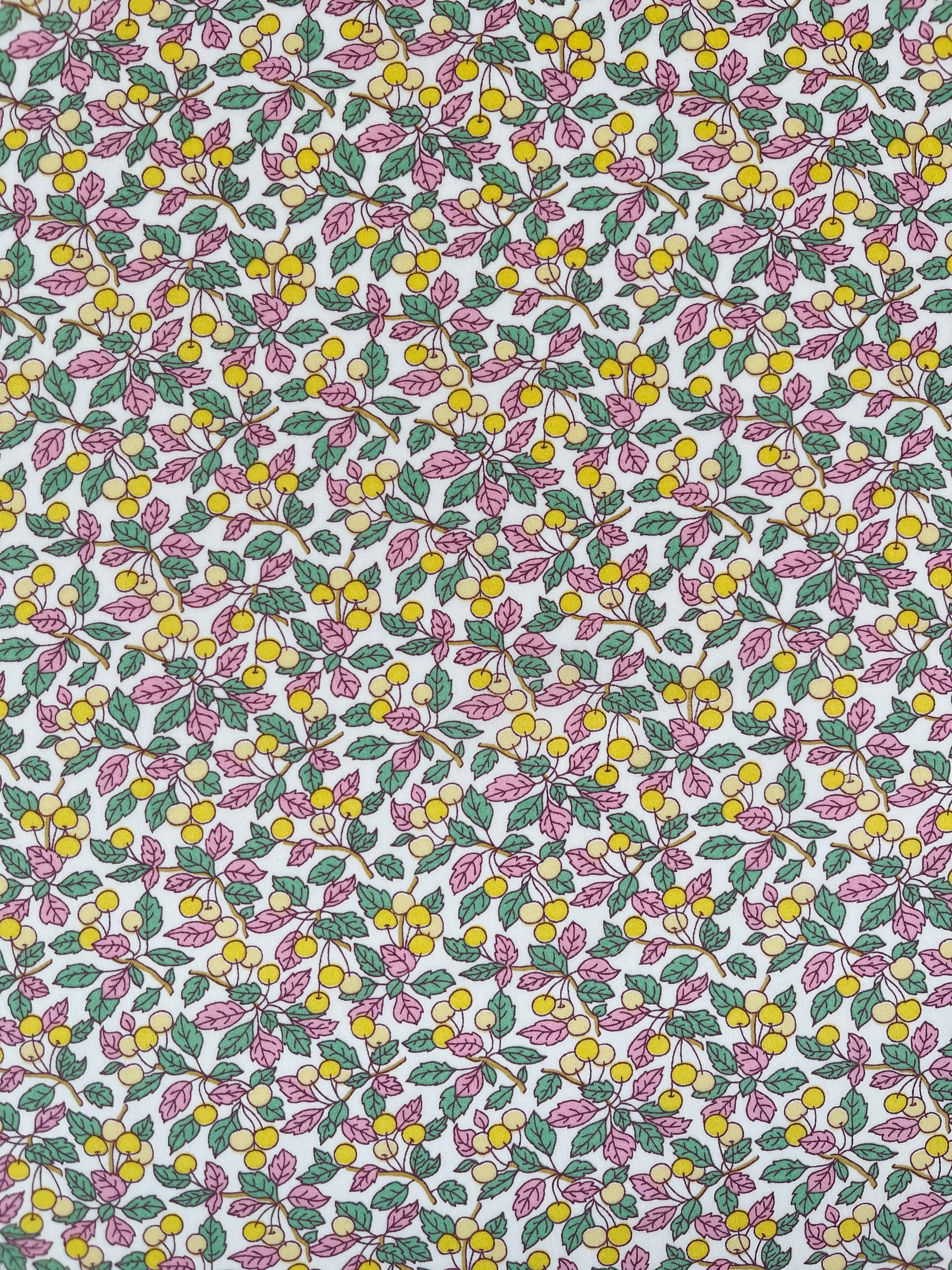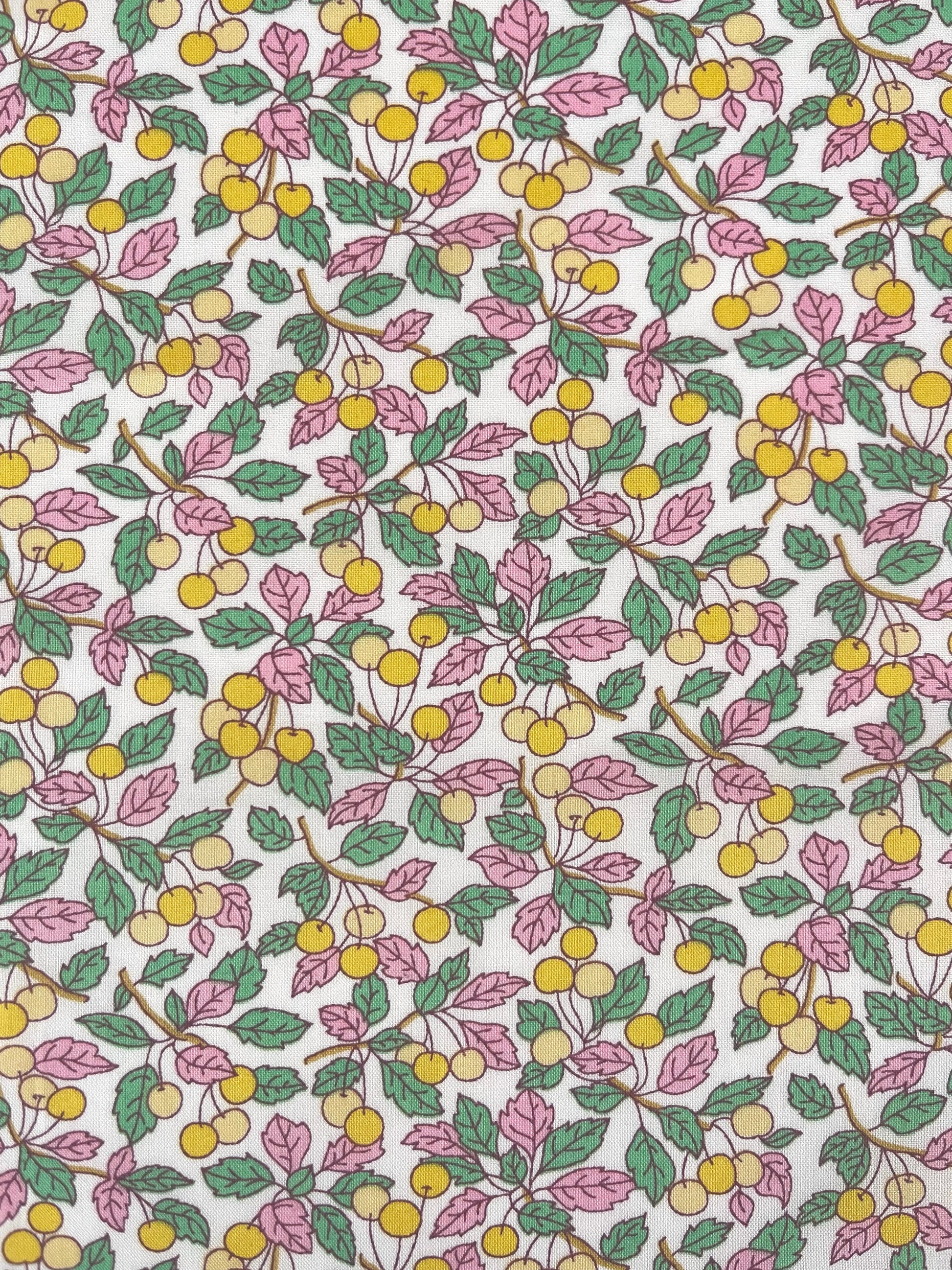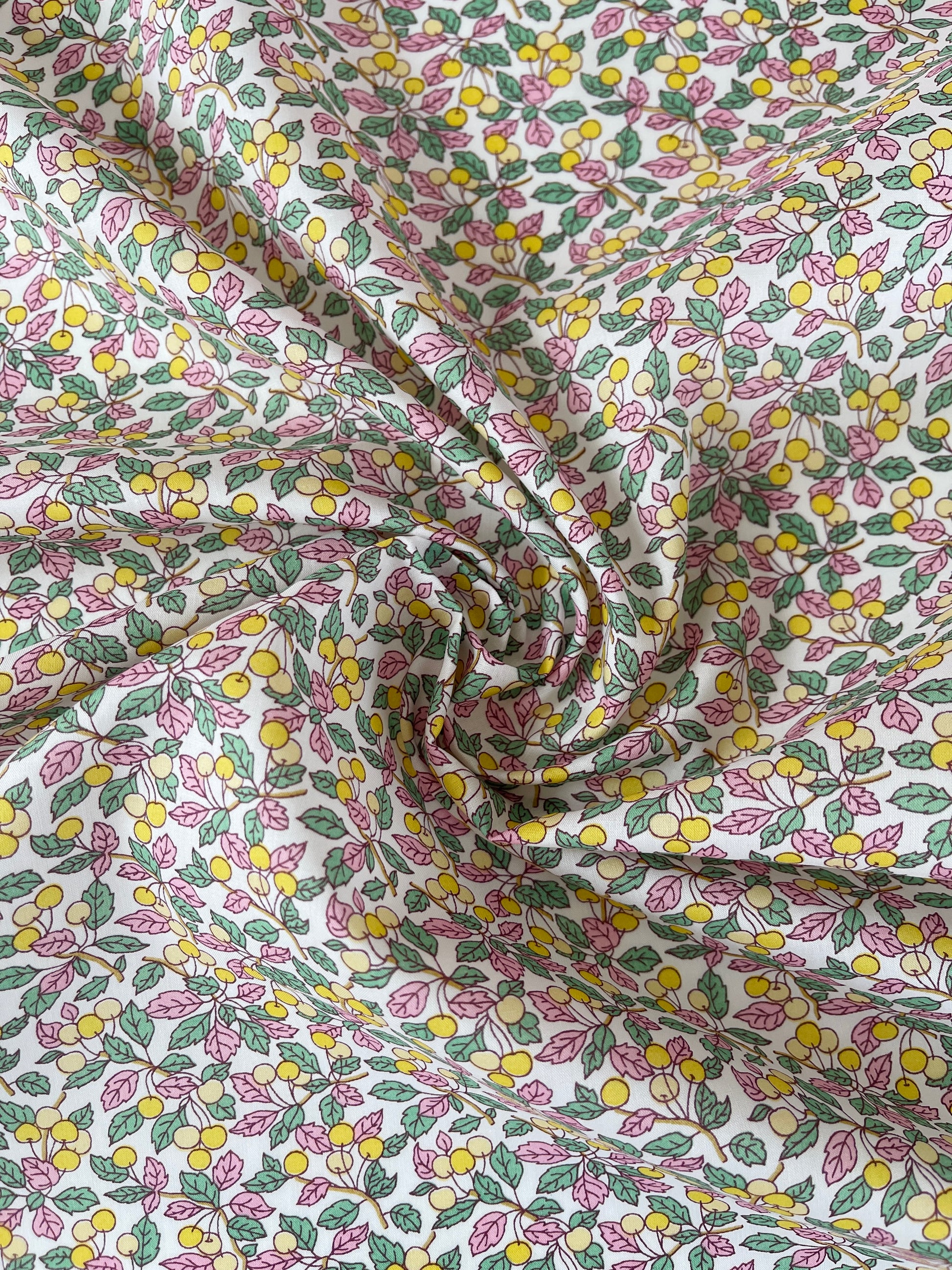 Liberty stof - Colleen’s Orchard et fint lille print med søde klaser af kirsebær 🍒 og blade. Printet er håndtegnet tilbage i 1960’erne af Colleen Farr. Her genoptrykt i Libertys forår/sommer 2025 kollektion.
