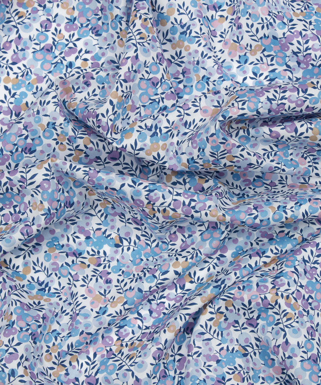 Liberty fabrics - også kaldet Liberty of London, er mest kendt for deres flotte blomsterstoffer, men laver også mange andre mere grafiske prints. Her Liberty stof - Wiltshire blå lilla. i den lækre kvalitet "tana lawn" som er kendt for dens silke - agtige overflade, som på trods af den fine bløde metervare er både slidstærkt og farveægte og som holder vask efter vask. Kvaliteten egner sig godt til at sy tøj i, så som kjoler, nederdele, bukser og skjorter. Den kan også sagtens bruges til at quilte med, hvorefter man kan lave flotte jakker og tasker. Jeg bruger den selv til at sy det lækreste sengetøj med. Trods bredden laver man det bare en smugle smallere, hvilket kun er en fordel, så dynen ikke svømmer rundt. Man kan også med fordel mixe de smukke prints og farver, som ser skønt ud, bl.a. som fine pyntepuder i sofaen, på sengen eller i børneværelset. Kun fantasien sætter grænser for de mange spændene kreative projekter