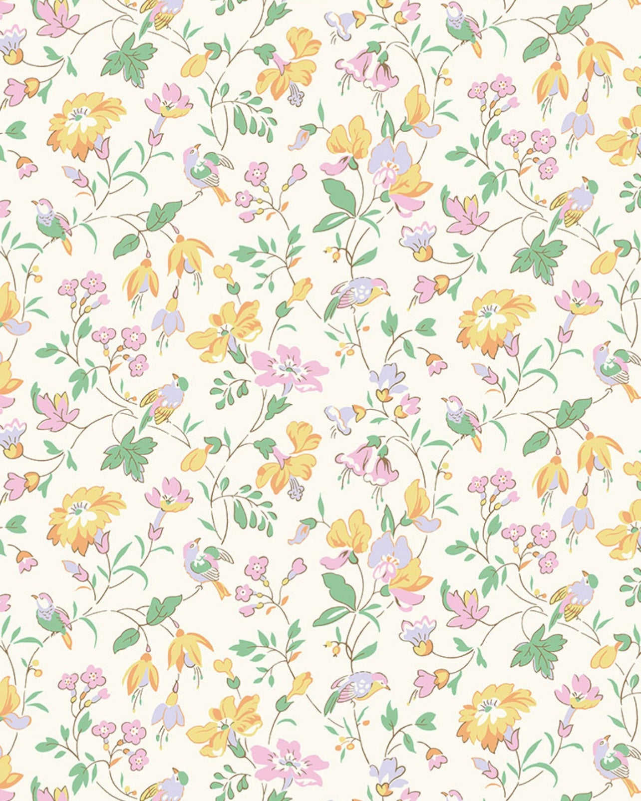 Liberty stof “Iveta’s garden” et smukt klassisk Liberty print i med søde blomster i rolige blå gule rosa turkise farver.