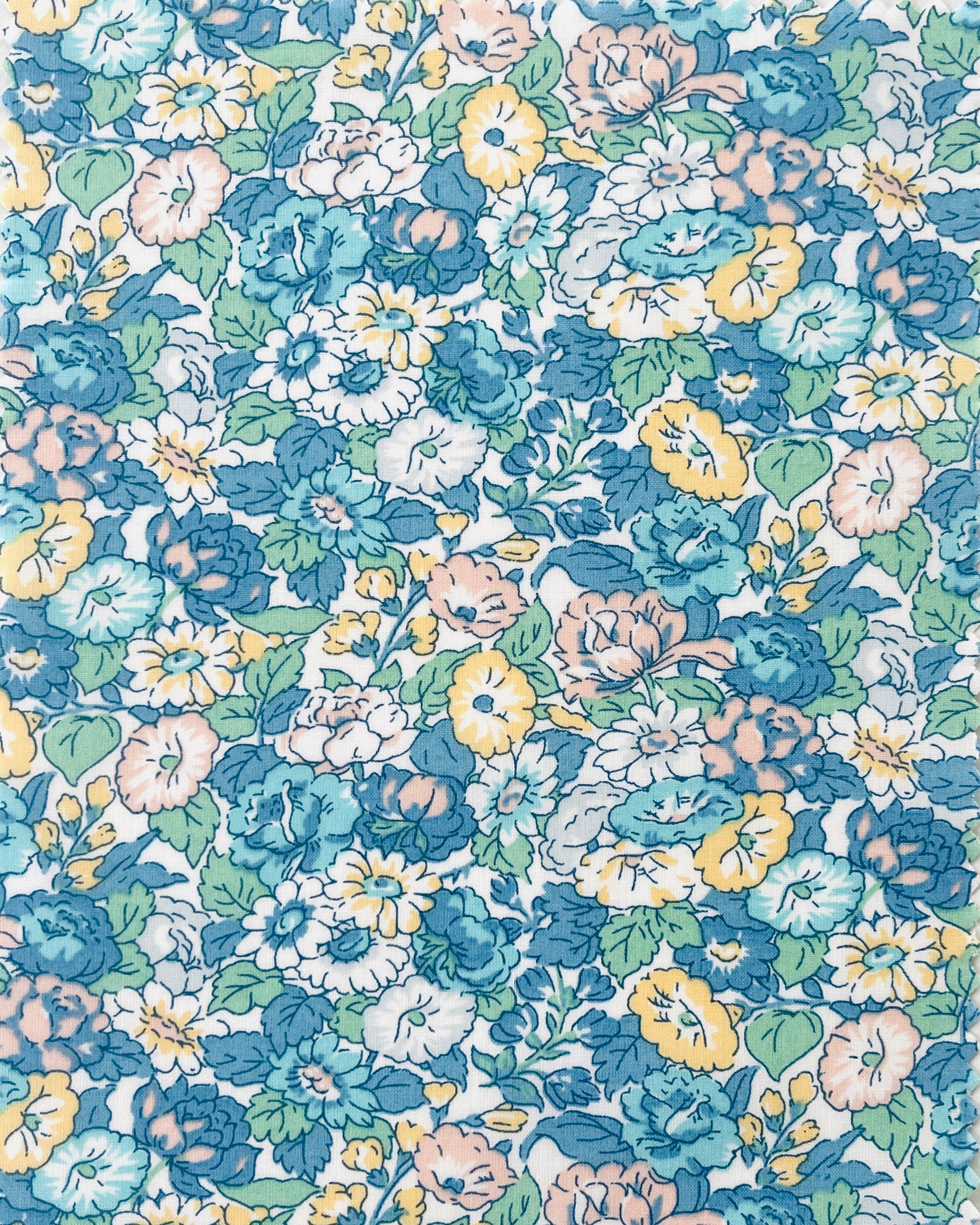 Liberty stof “Leontyne Dream” et smukt klassisk Liberty print i med søde blomster i rolige blå gule rosa turkise farver.